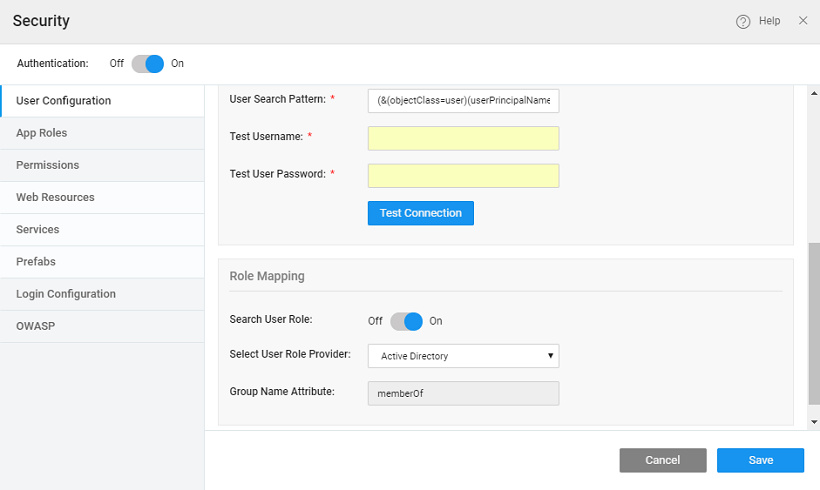 Once you have configured the security provider, click the Test Connection button, test user credentials are authenticated in this step. Keep in mind, during runtime, the authentication will happen based on user credentials and user search pattern. See here for more use cases.