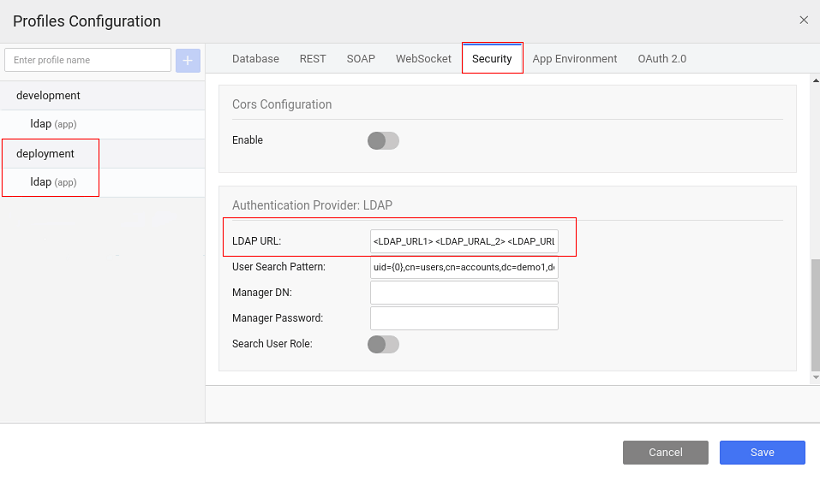 ldap://localhost:389/dc=wavemaker,dc=com. For deployment profile, you can specify multiple LDAP server URLs, if required, by providing the multiple LDAP URLs as space-separated values, from the security tab of the Profile Configuration.