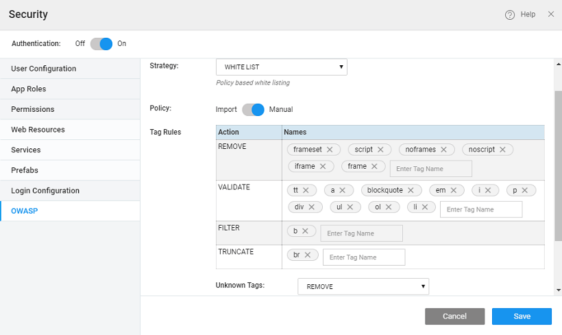 - Manual tags: Custom tag rules can be specified in terms of HTML tags which are categorized based on their actions. The possible actions are Validate, Remove, Truncate and Filter. These rules are used while handling the tags in the XSS attacks. You can add or delete tags against an action. We can specify the action for all Unknown tags also.