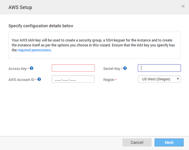 - While setting up the AWS account care should be taken to ensure that the IAM key has the permissions as listed in the configuration dialog.