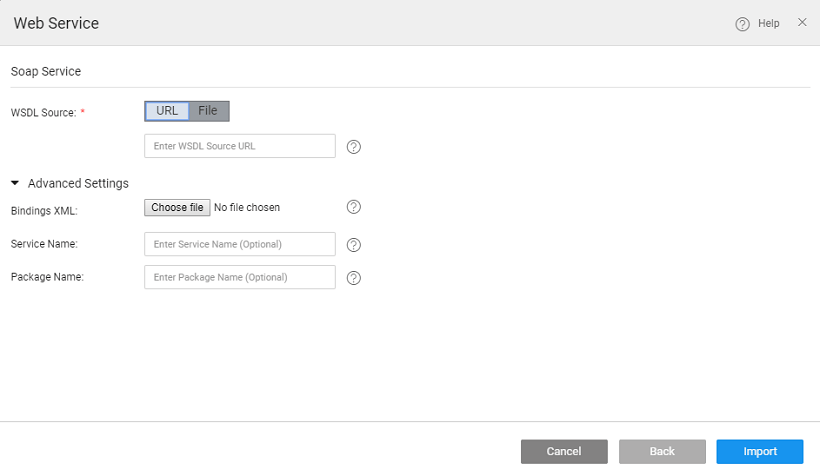 WSDL SourcetoFileand clickChoose Fileto upload the.wsdlfile from your local machine. The file can be an individual file or a group of files packaged into a zip file.