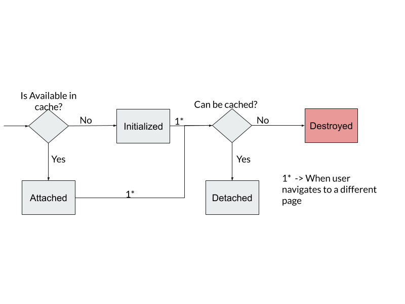 | Step | User navigated to | Initialized | Attached | Detached | Destroyed |
