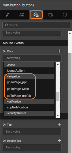 - Button click – Use the button’s On click event to trigger a move to a new page.
