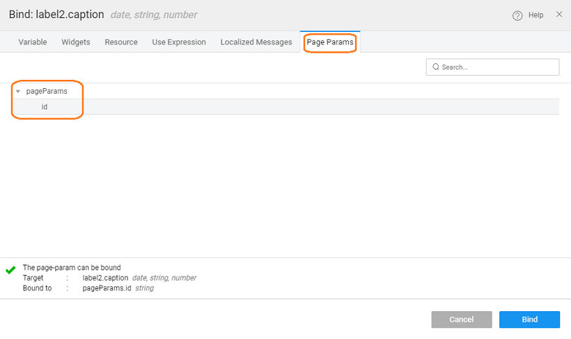 • Page Params are available on the page/partial scope and can be used in the same. These parameters can be accessed from the Page Param tab on the binding dialog.