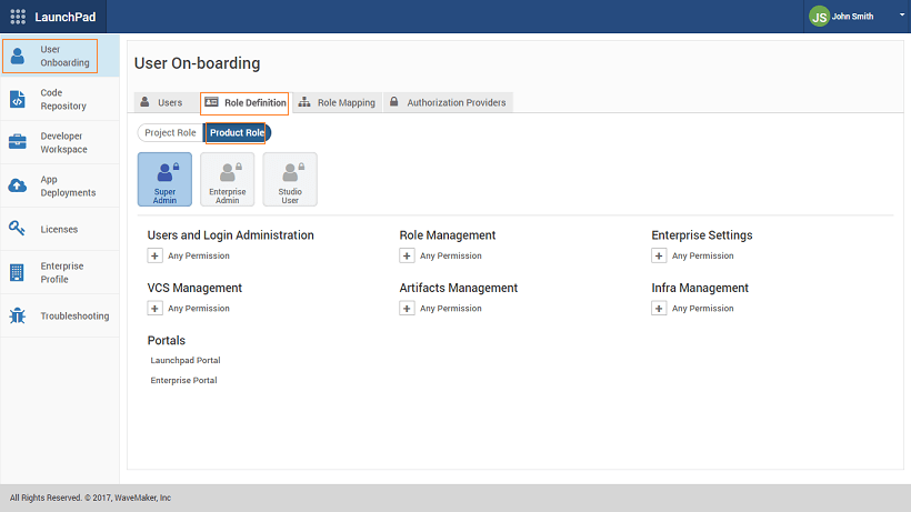 Launchpad Role Definitions: Roles can be created from the Role Definition tab of the User On-boarding section of Launchpad. As mentioned earlier the Product Roles are pre-defined with permissions set and they cannot be modified.