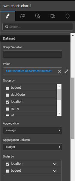 - The various outbound properties of a chart are available for binding to other widgets or variables. The fields under selecteditem will be from the underlying dataset used for binding.