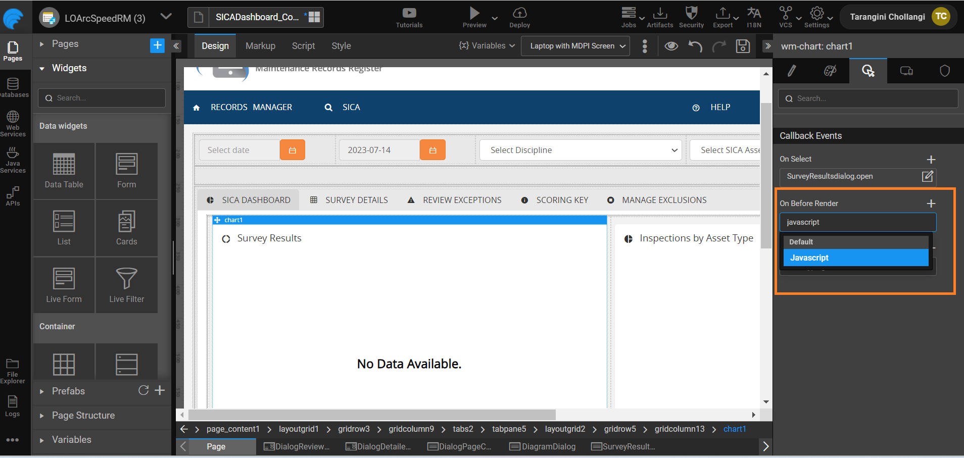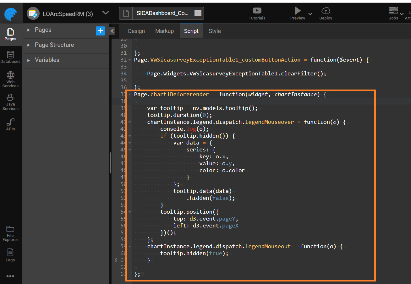 - Set the Pie Chart's "On Before Render" property to JavaScript.
