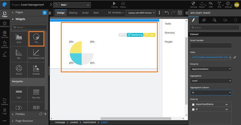 - Go to the page layout of your application and drag-and-drop the required chart widget. Here, we are creating a column chart.