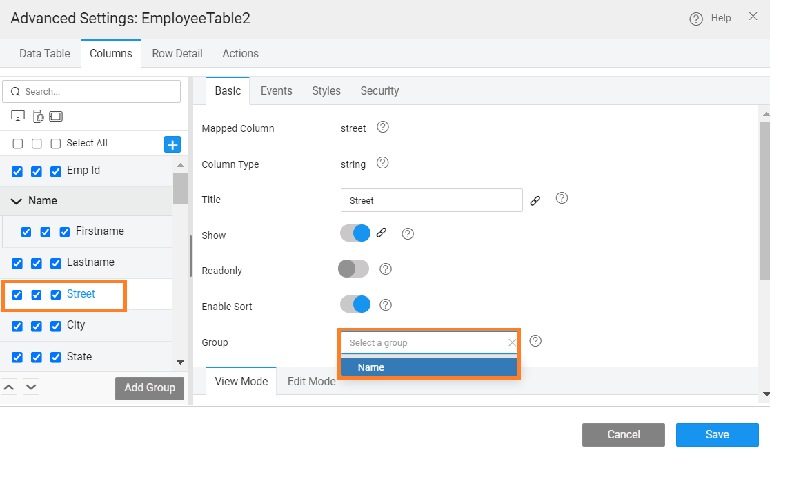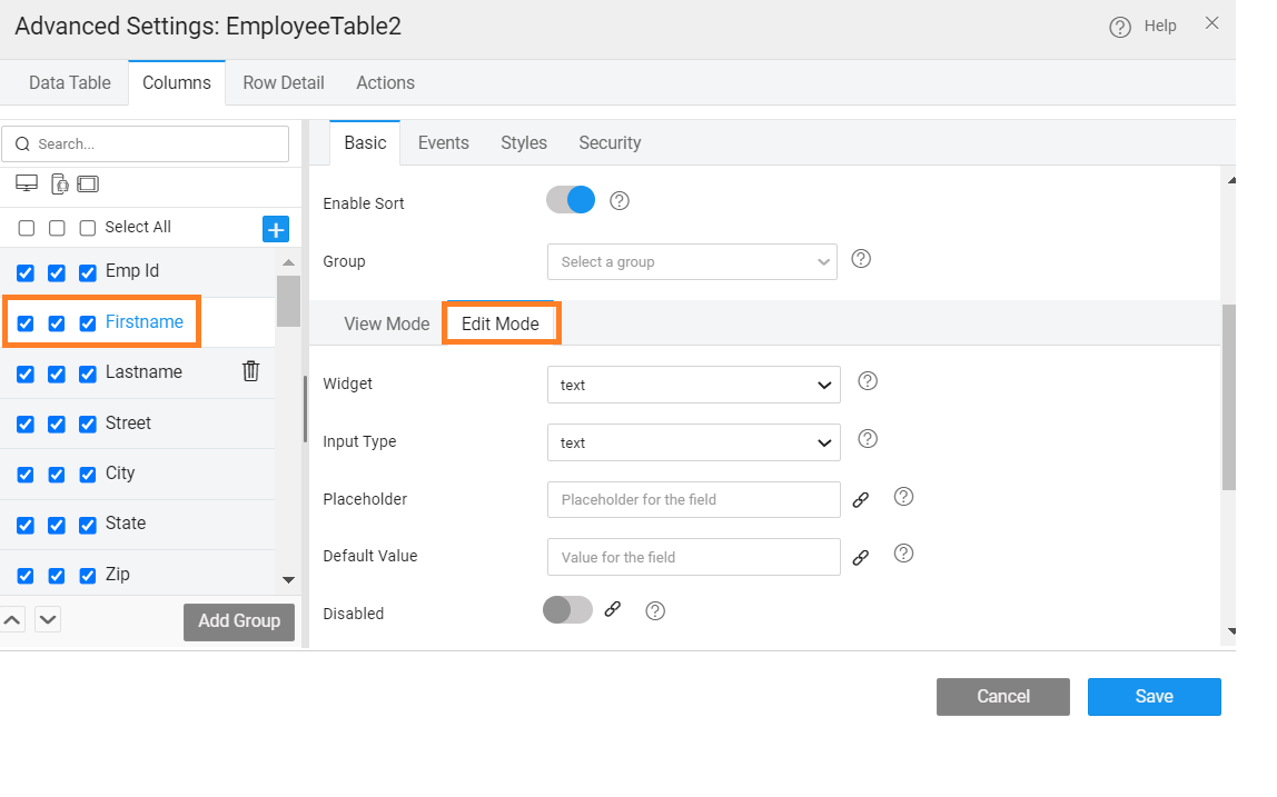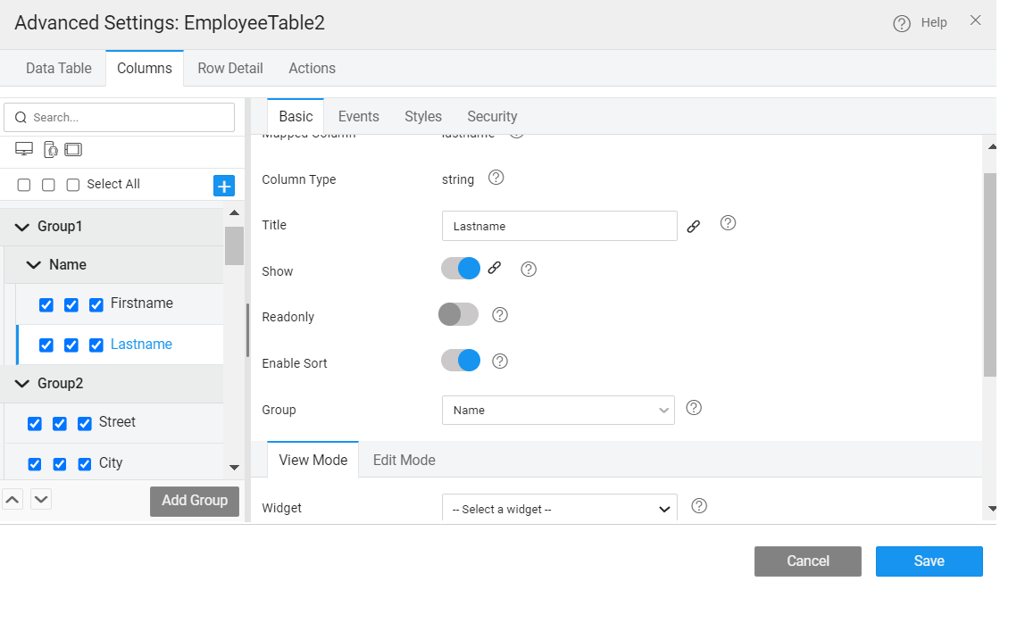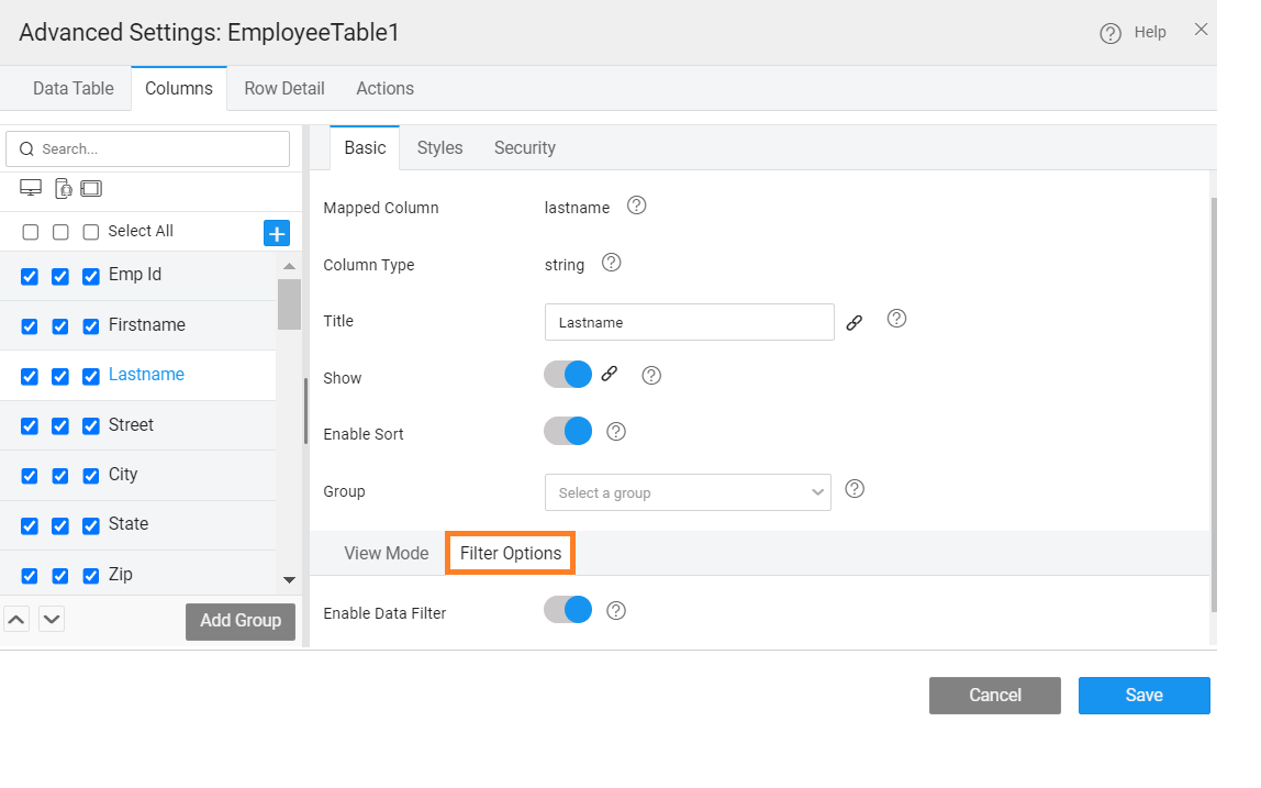 The columns or fields to be displayed in a Data Table can be further configured: