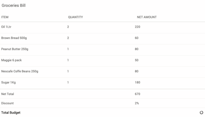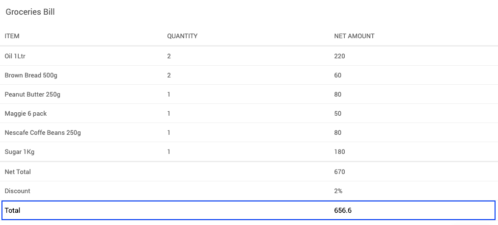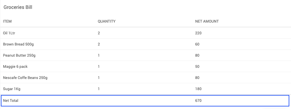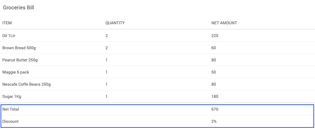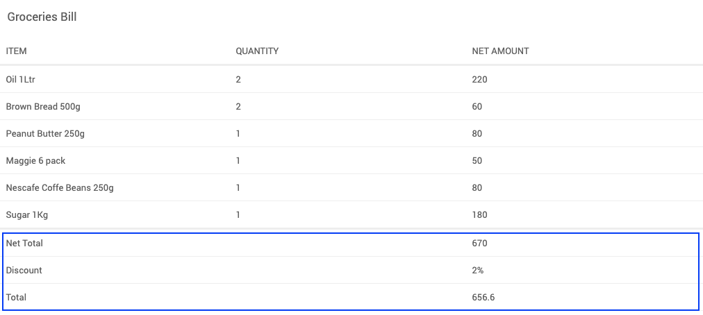 Using Summary Row Function, you can summarize any number of columns. A table can also include more than one summary row. To calculate the summary, you can simply use in-built javascript functions like sum, minimum, maximum, percent. Application developers may also write their own javascript function that calculates the summary.