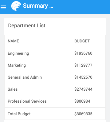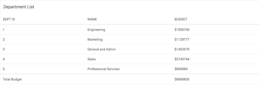Here, if the column deptId is present in the table, the label "Total Budget" is rendered under the respective column. Otherwise, it renders under the name column.