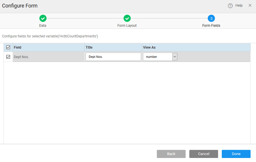 - Select Layout and Configure Fields changing the display name and widget type if needed. Note that if the database API Variable underlying the Form, has to have some input fields the same should be done using the Data tab of the Variable.