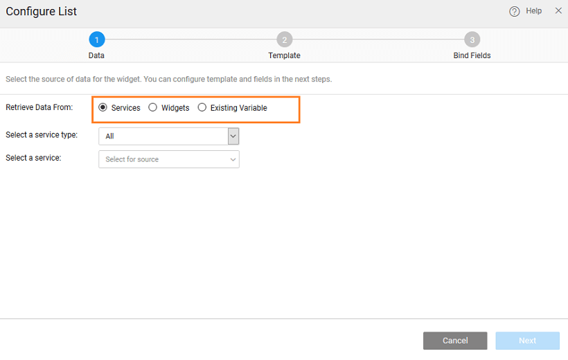 The first step in configuring a list is to define the data that needs to be displayed. This data can be in the form of Services or Widget or Existing Variable.