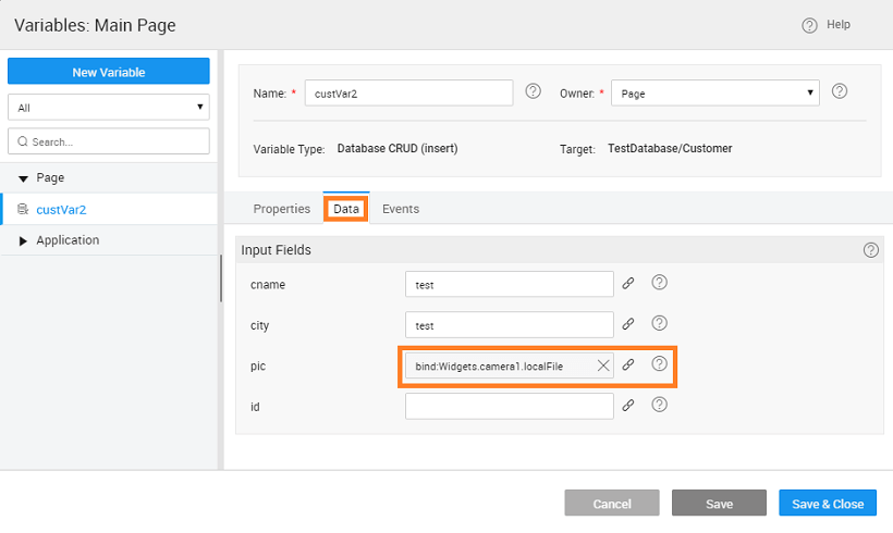 - Bind the Input Fields from the Data tab for the CRUD Variable to the Camera -> localFile field