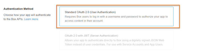- Select Authentication Method as Standard OAuth 2.0(User Authentication) to authenticate the Box APIs.