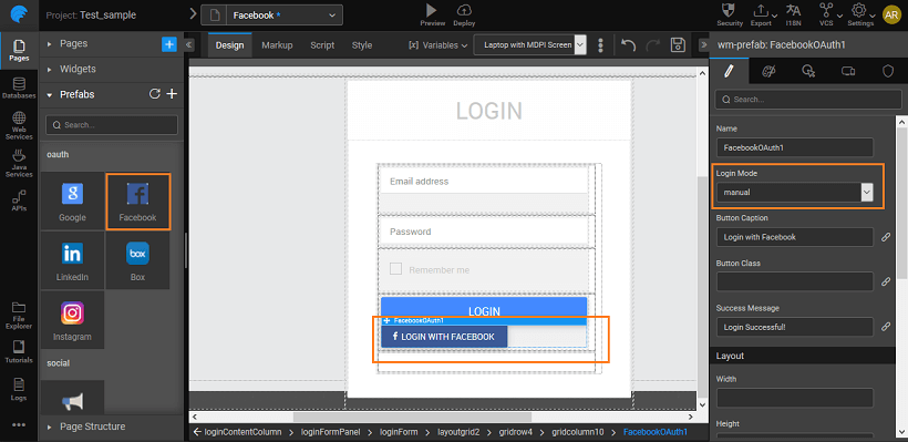 2. Drag and Drop the Facebook Prefab from the Prefabs Tab under OAuth. You can use the default login page created by WaveMaker.