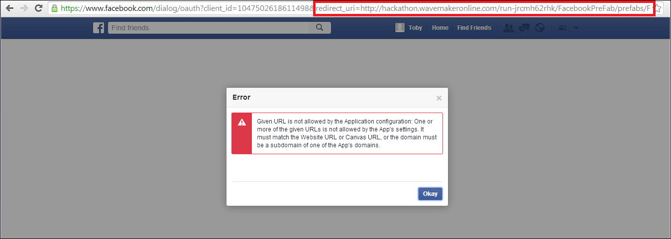 5. Save the application and Run the application. Note the generated redirect URL. You might have to click REMOVE TOOLBAR to get the URL. Copy the redirect uri till the callback part only.