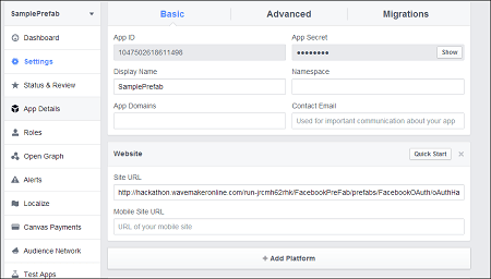 10. Enter a sample valid URL in the Site URL field and click Next. Your App Dashboard page is displayed. Note: Make a note of the App ID and App Secret.