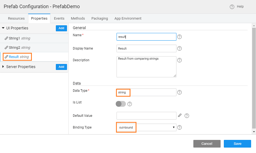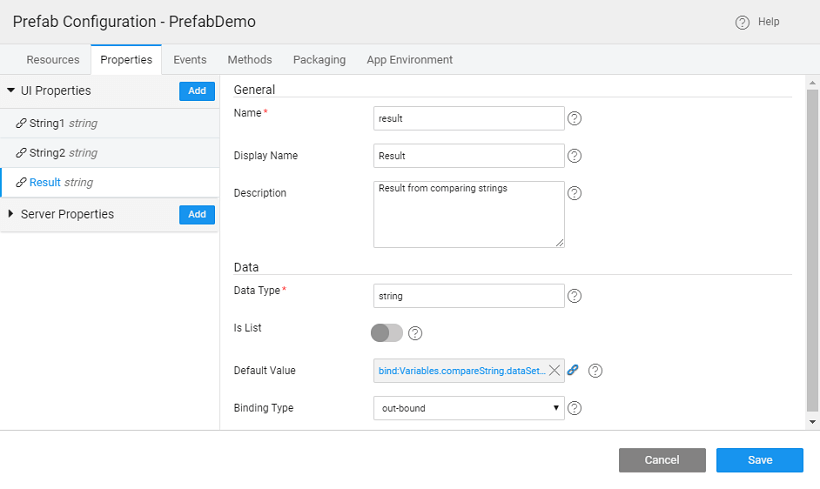 1. The result from the Java method needs to be bound to the outbound property declared in the above steps. From the Prefab Settings, Properties tab bind the result of the Java Service to the outbound property of the Prefab.