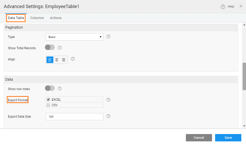 - From the Data Table tab, scroll down to locate Export Format option and select required format.