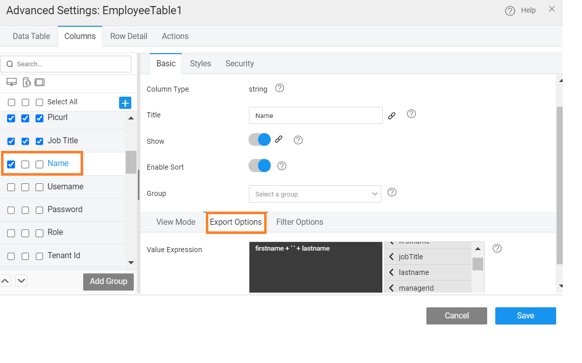- Navigate to Columns tab and note that for each column Export Options tab is visible. Use this to customize the data to be exported. NOTE: If you have any custom columns, value expression has to be given here, else the export will fail.