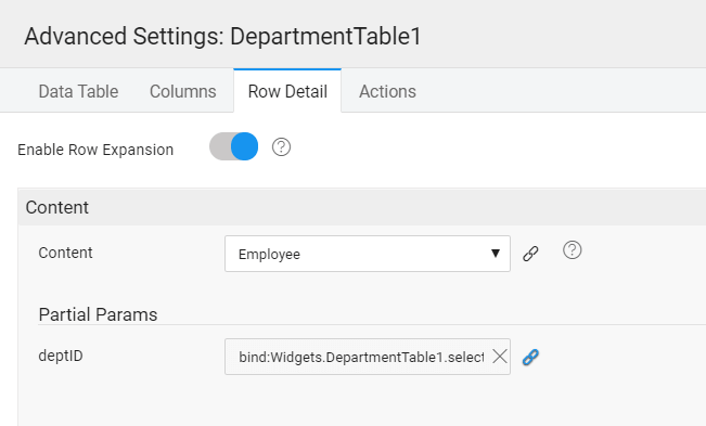 In this article, you will learn how to configure row expansion on a data table. To use the row expansion feature, you create a data table and a partial; you configure the partial to contain related information of the table item. A partial is a semi page which is a reusable object, and a data table is a data widget configured as a variable. You add page params in the partial page and bind it through the data table settings.