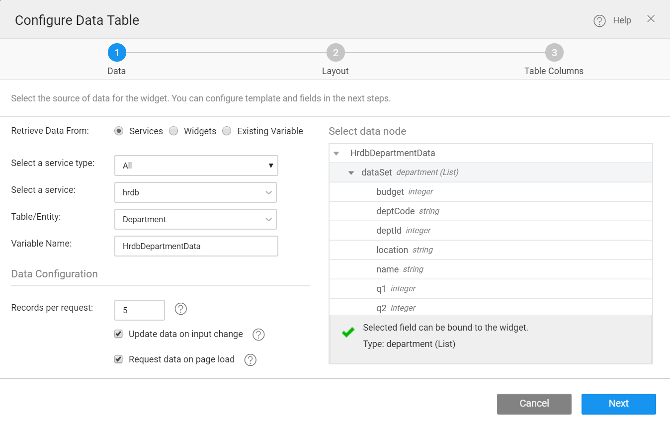- Table/Entity → Department → A variable will be created automatically, for example, HrdbDepartmentData.