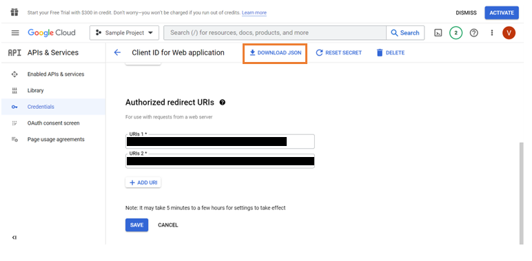 In the Credentials section, enter the Authorized redirect URIs and click Save.