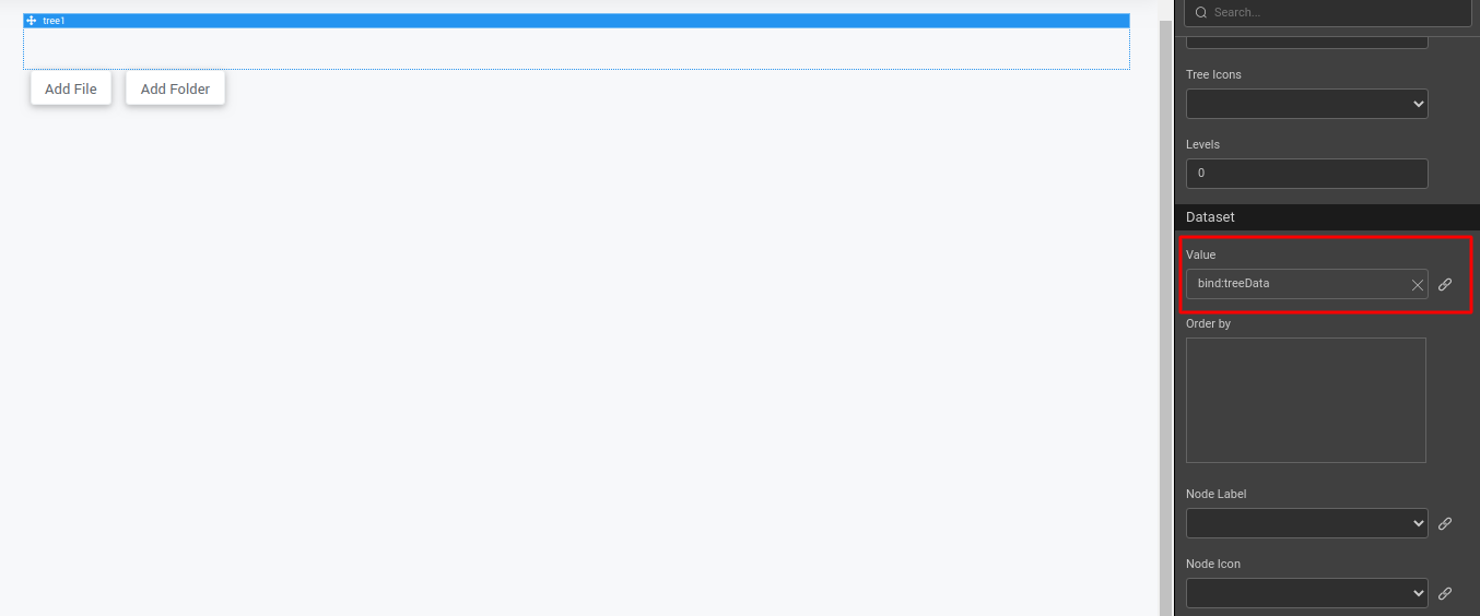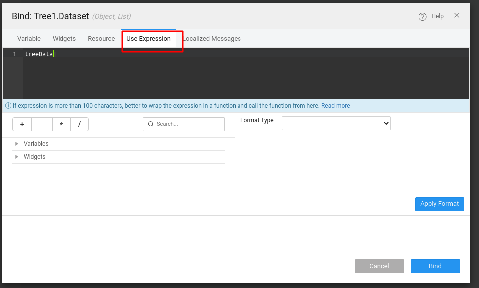 - Select the Tree widget. Go to Value property and click the bind icon under the Dataset section. Go to the Use Expression tab and set the script variable as