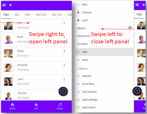 - Currently, the swipe gesture is supported by Left Panel, Tabs, and Carousel (Static) widgets.