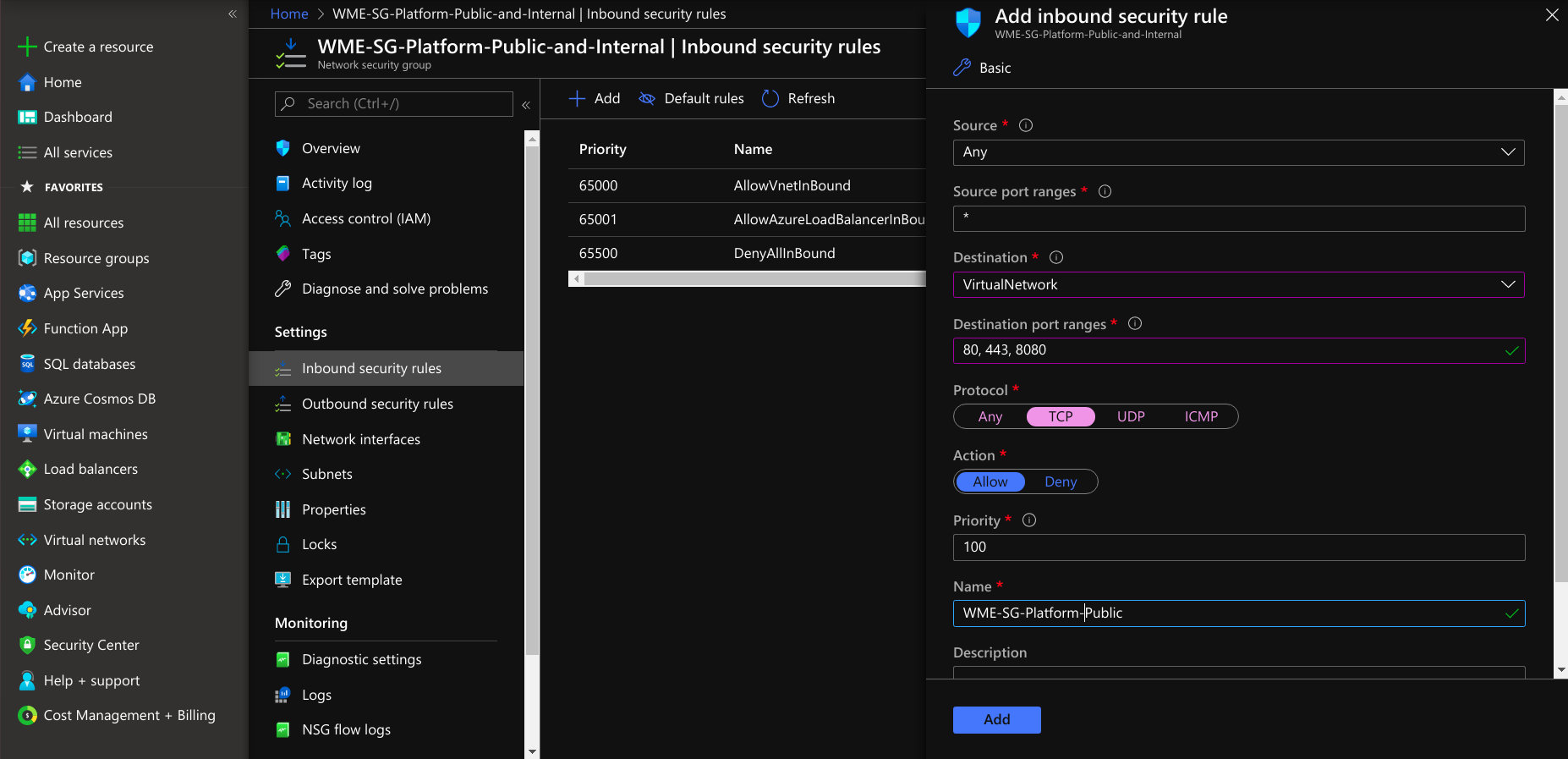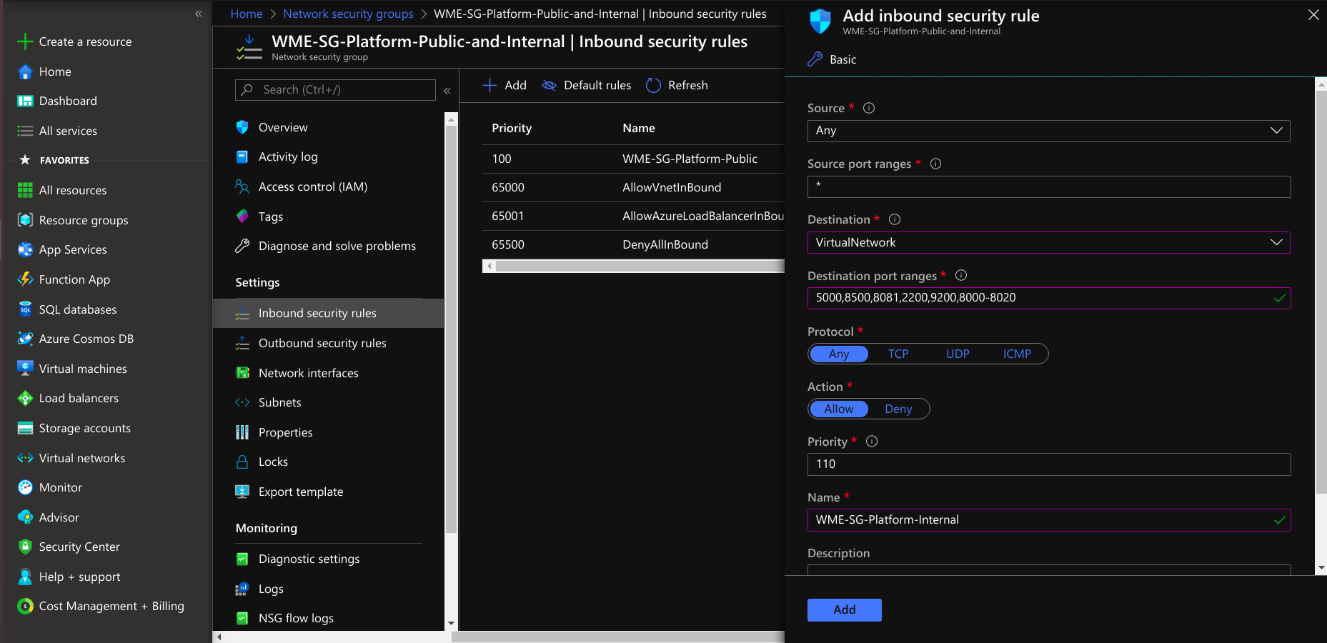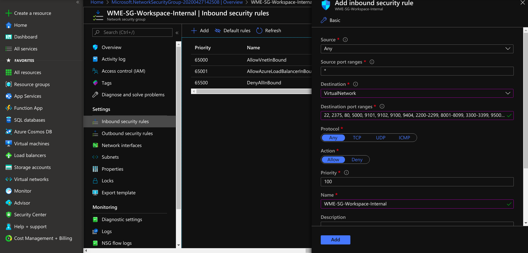 - After creating the network security group under settings, select inbound security rules, create a rule for developer network access and select protocol TCP and add a rule to a network security group.