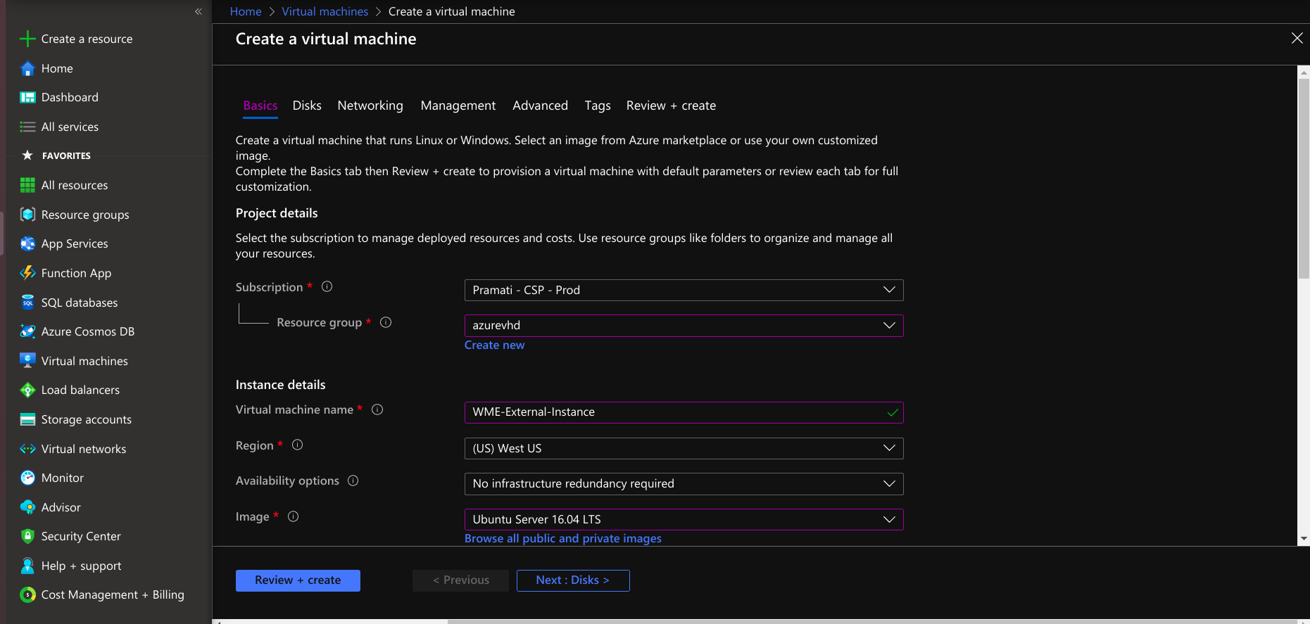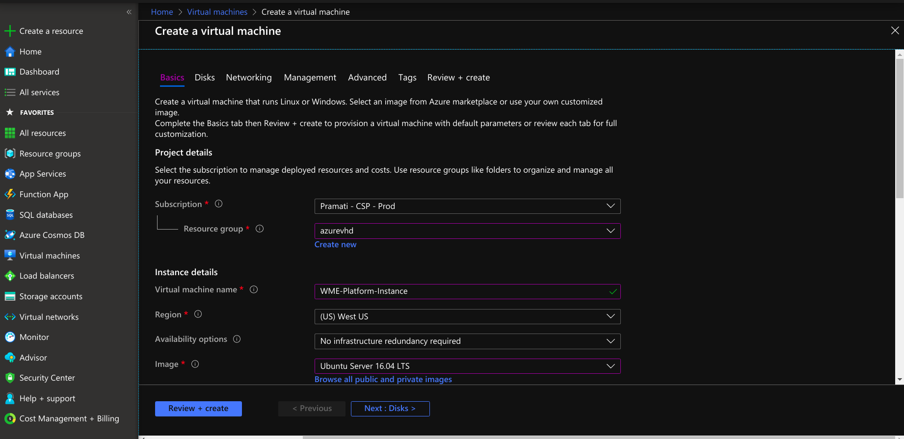 - Select Ubuntu 16.04 image, 4 vCPU, and 16 GiB (gigabyte) memory. For WME platform virtual machine, select the same resource group and region of the virtual network and network security group.