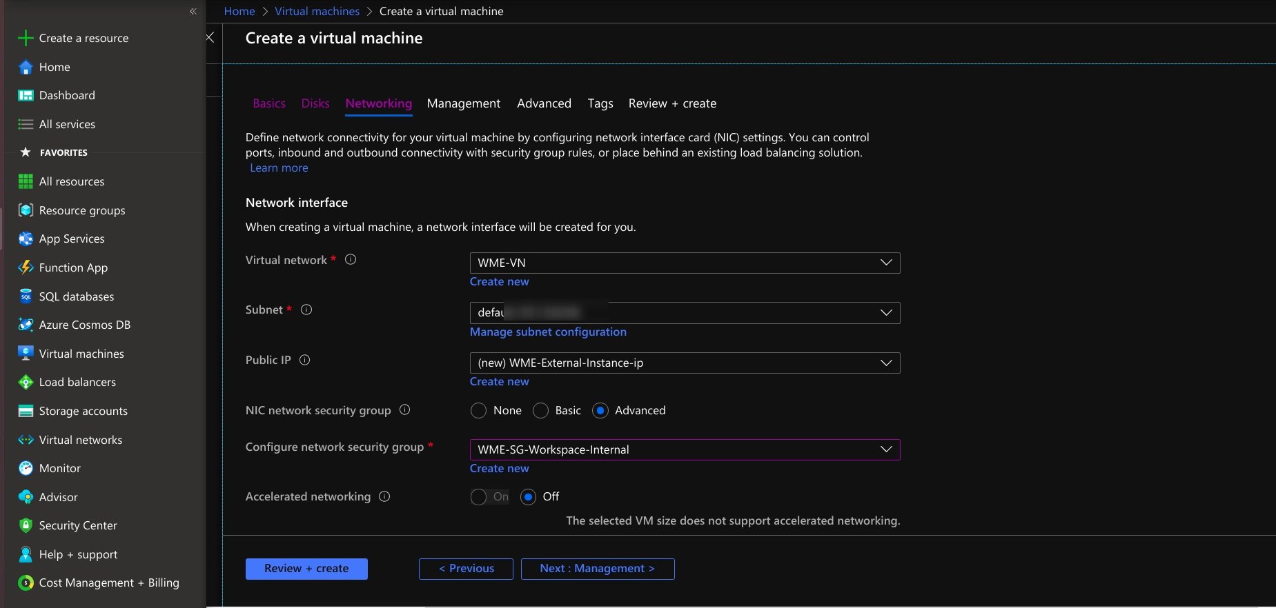 - At the networking section, provide the created-virtual network details for the virtual network. At the NIC network security group, select advanced options to give the network security group of Studio Workspace Virtual Machine/App Deployment Virtual Machine.