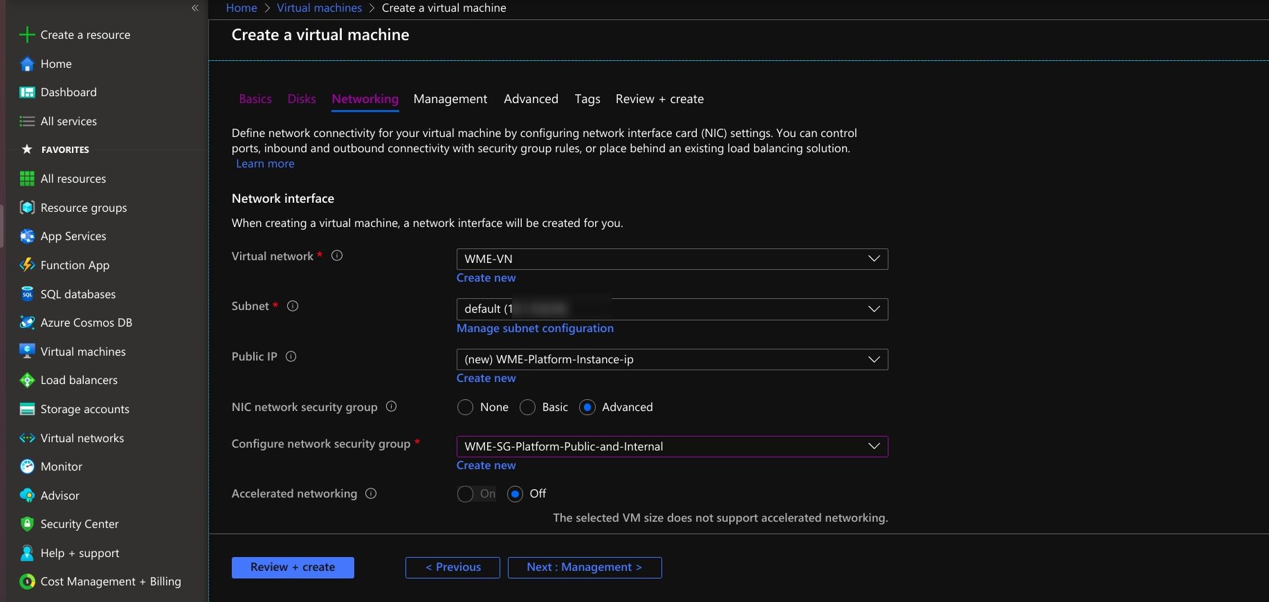 - At the networking section provide created virtual network details at the virtual network and at the NIC network security group select advanced options provide network security group of the platform.