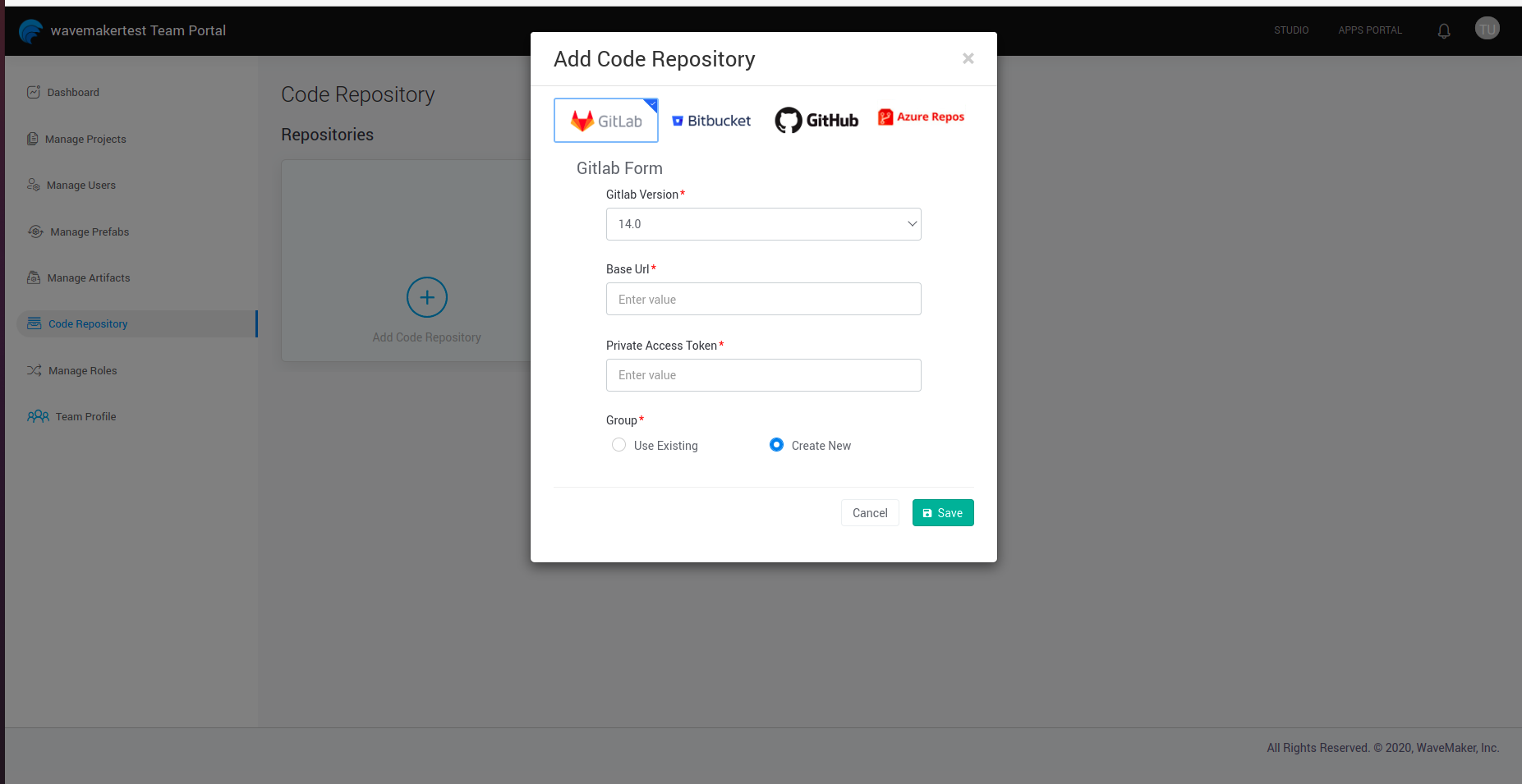 - After selecting Add Code Repository, select the repository type and provide the required details for adding the repository. As default providers, WaveMaker supports Gitlab, Bitbucket, Github and Azure for external VCS configuration. Select Save to save the changes.