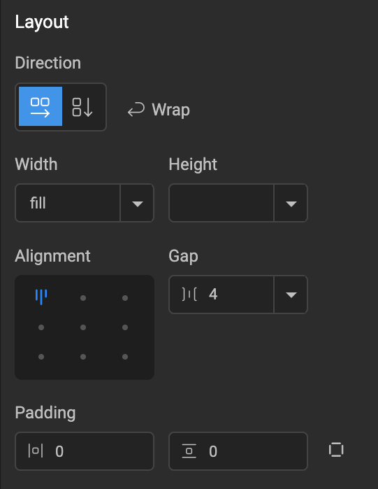 The Wrap property is available when direction is set to Row. It controls whether child widgets should flow onto a new line when they exceed the available space along the row.